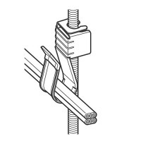 ボルトに押し込むだけで取り付け完了。解除も簡単です。樹脂カバーが施してありますからケーブルを傷つけません。二重天井等、吊りボルトへのVVFケーブルの取り付け(支持)に使用します。