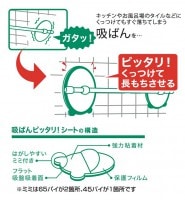 材質は、粘着シール部がポリウレタン、フラット面がPETフィルム。キッチンやお風呂場のタイルなどにくっつけても、すぐ落ちてしまう吸ばんを、ピッタリくっつけて長持ちさせます。 はがすとき便利なミミ付き(65φ : 2個、45φ : 1個)。写真は65φ。キッチンや浴室の小物収納に。