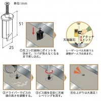 基礎天端を高精度に出す事ができます。微調整ができるので、セルフレベリング材を使用する現場に最適です。らくらく天端ビスを予め入れておけば、生コン硬化後でもビスが上下するので天端レベル合わせが可能です。ねじビッチが細かいので高精度に調整できます。天端レベル出し用ビス。