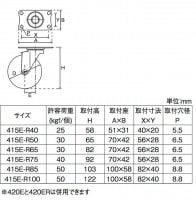 キャスター 自在 ゴム車輪 ストッパー付 (プレートタイプ) 415E-R50 [4個]