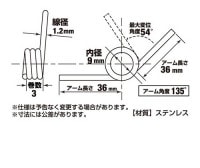 ■キックばね、きっくばね、ねじりコイルばね、トーションばね。ポストや冷蔵庫のパーツ補修品として。■サイズコード : T078B 材質はステンレス(SUS304-WPB)。回転方向に対しての荷重に利用するのに便利なばねです。●線径 1.2mm●内径 : 9mm ●アーム長さ : 36mm ●角度 : 135度●巻数3/※画像は商品サイズにより異なります。※予告なく仕様を変更する場合があります。※大口の場合は見積を承ります shop@yht.jp