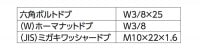 材質は鉄で溶融亜鉛めっき。6角ボルトW3/8X25(1本)、ナットW3/8(1個)、ワッシャーM10X22X1.6(1個)のセットになります。マルチアングルを組み立てる際に使用します。